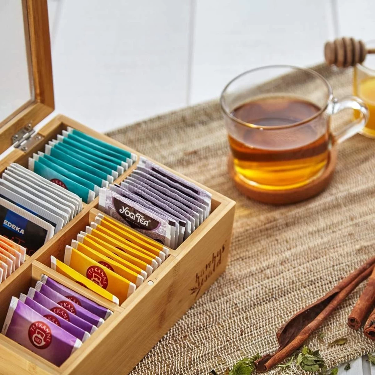 In deze mooie theekist kunt u niet alleen al uw favoriete thee, maar ook specerijen, kruiden, koffiepads, sieraden en andere kleine dingen bewaren. De kist ordent alles snel en met de warme houtkleur past het mooi in iedere keuken. Met deze theekist kunt u uw thee aanbod stijlvol aanbieden.