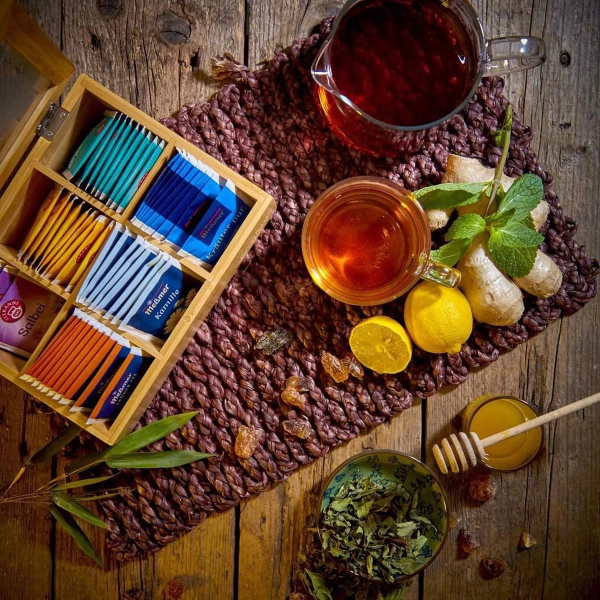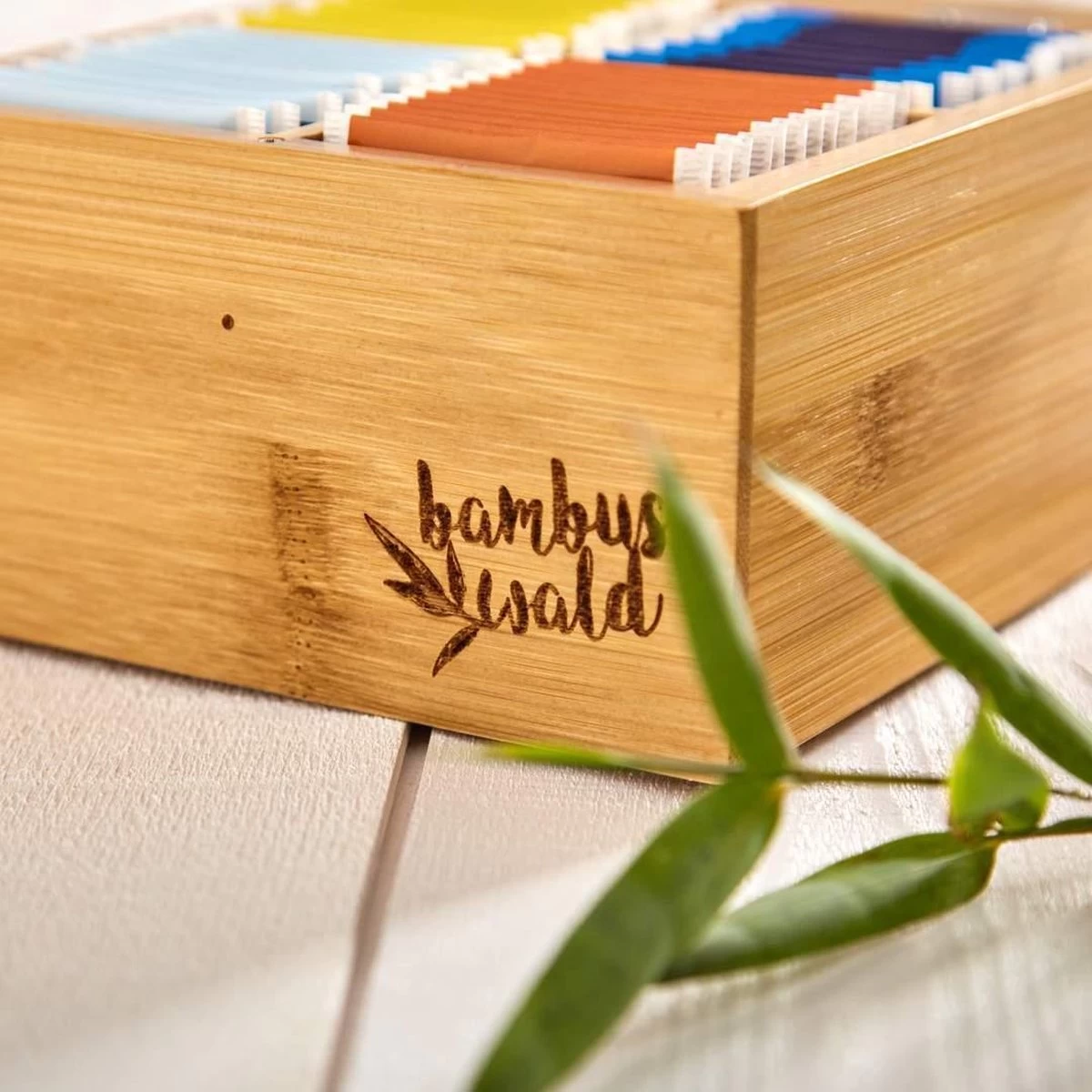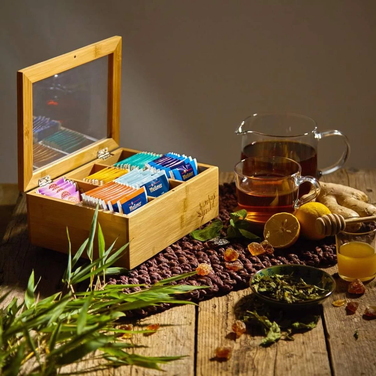 De Theekist is gemaakt van bamboe, een fantastisch gras uit de Chinese bossen. De plant heeft een hoge CO² opslagcapaciteit en groeit heel snel, waardoor men frequent kan oogsten. Meststoffen, pesticiden, of zelfs irrigatie is niet noodzakelijk. Dus je theedoos is 100% milieuvriendelijk.