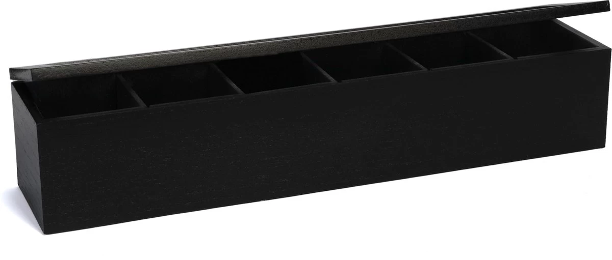 | Verpakkingsinhoud | CasaLupo Theedoos Zwart 6-vaks – met Fluweel – 43 x 9 cm |