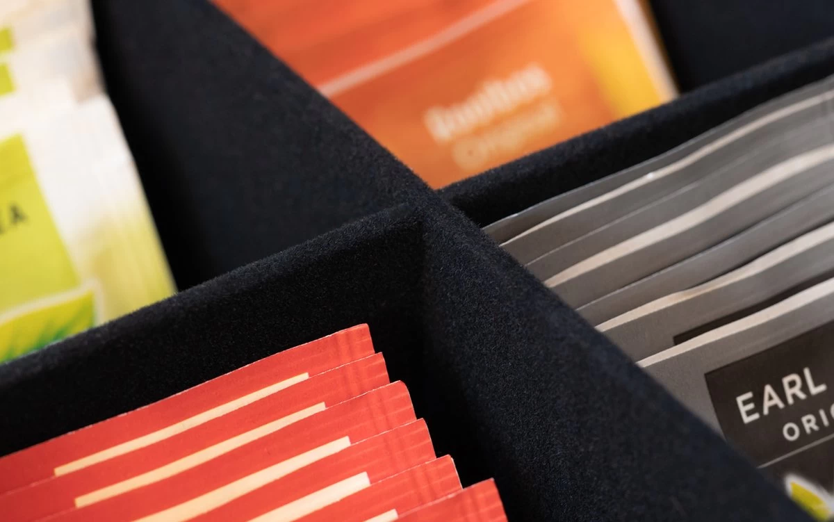 Hou al je theezakjes overzichtelijk bij elkaar met deze Theedoos Zwart 9-vaks – met Fluweel – 23 x 23 cm! De theedoos is gemaakt van hout en heeft 9 vakjes. Ook heeft hij een doorzichtige deksel, zodat je gemakkelijk alle theesmaken kan zien. De theedoos heeft een afmeting van 23 x 23 cm en de binnenkant is van fluweel.