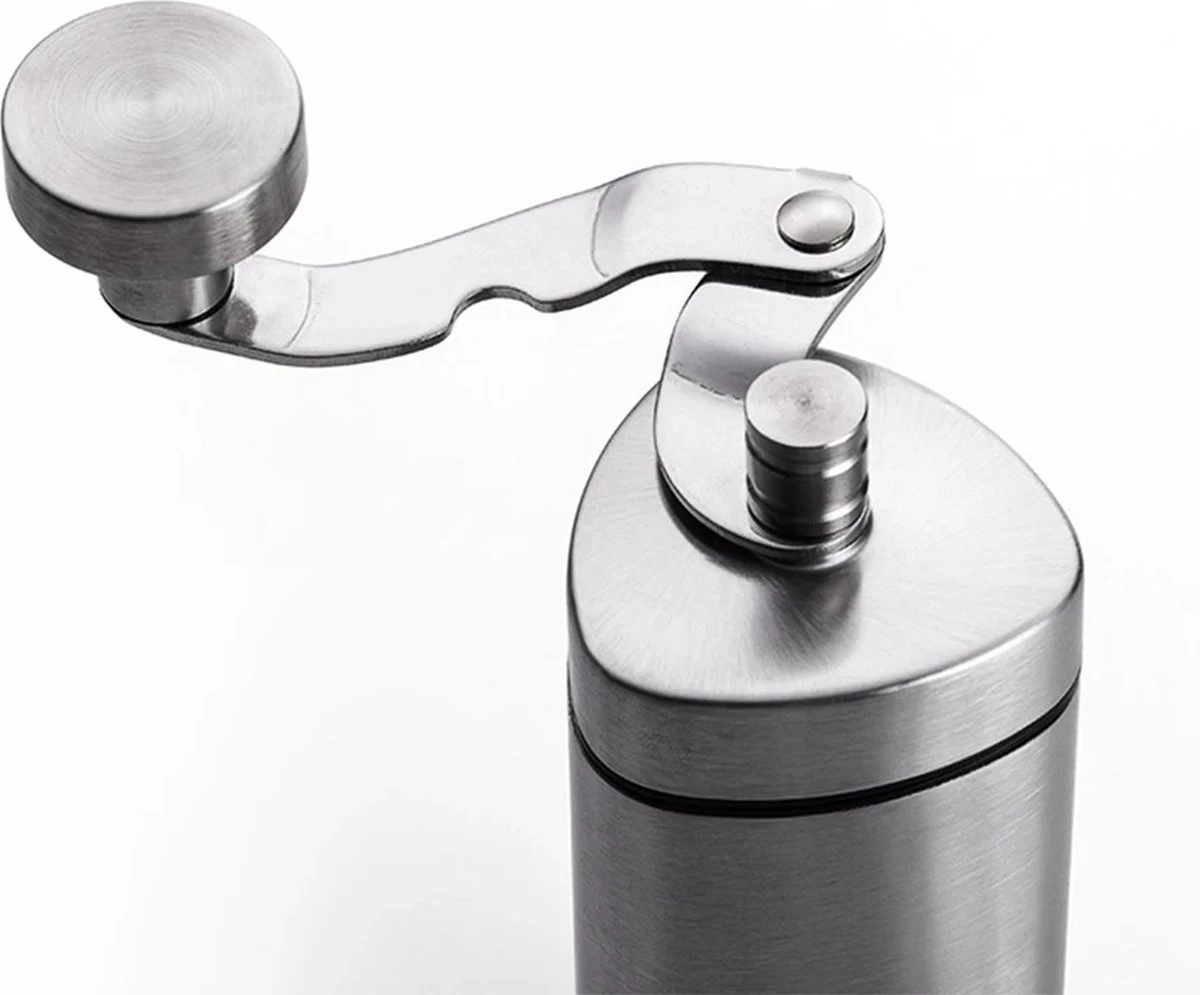De roestvrijstalen behuizing maakt de koffiemolen elegant en sterk. Alle componenten zijn gemaakt van roestvrij staal en voedselveilige kunststoffen. De ergonomische, inklapbare slingerhandgreep biedt een effectieve hefboomwerking voor een soepele en gemakkelijke vermaling en elimineert tegelijkertijd vervelend geluid.