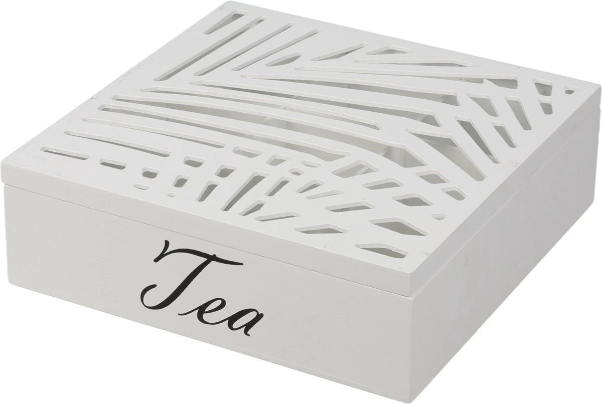 Theedoos/theekist wit. De theedoos beschikt over 9 vakjes en is geschikt om theezakjes van 6,5 cm (Pickwick) rechtop neer te zetten. Materiaal: MDF/hout. Maat: ca: 24 x 24x 7 cm. Theedozen/theekisten.