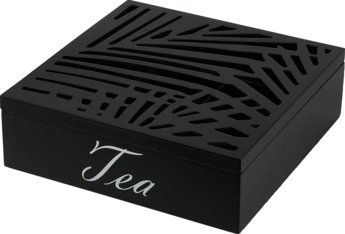 Theedoos/theekist zwart. De theedoos beschikt over 9 vakjes en is geschikt om theezakjes van 6,5 cm (Pickwick) rechtop neer te zetten. Materiaal: MDF/hout. Maat: ca: 24 x 24x 7 cm. Theedozen/theekisten.