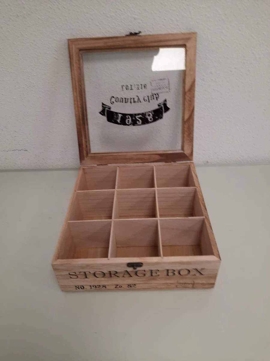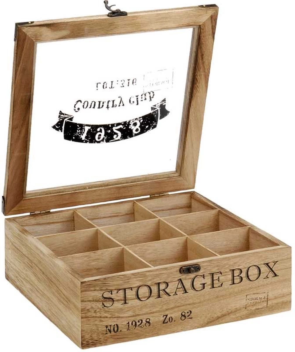 De houten theebox heeft een stoere uitstraling. In de 9 vakken kun je altijd je favoriete theezakjes opbergen. De prachtige letters maken de uitstraling compleet. De theekist is gemaakt van hout en heeft een glazen deksel.