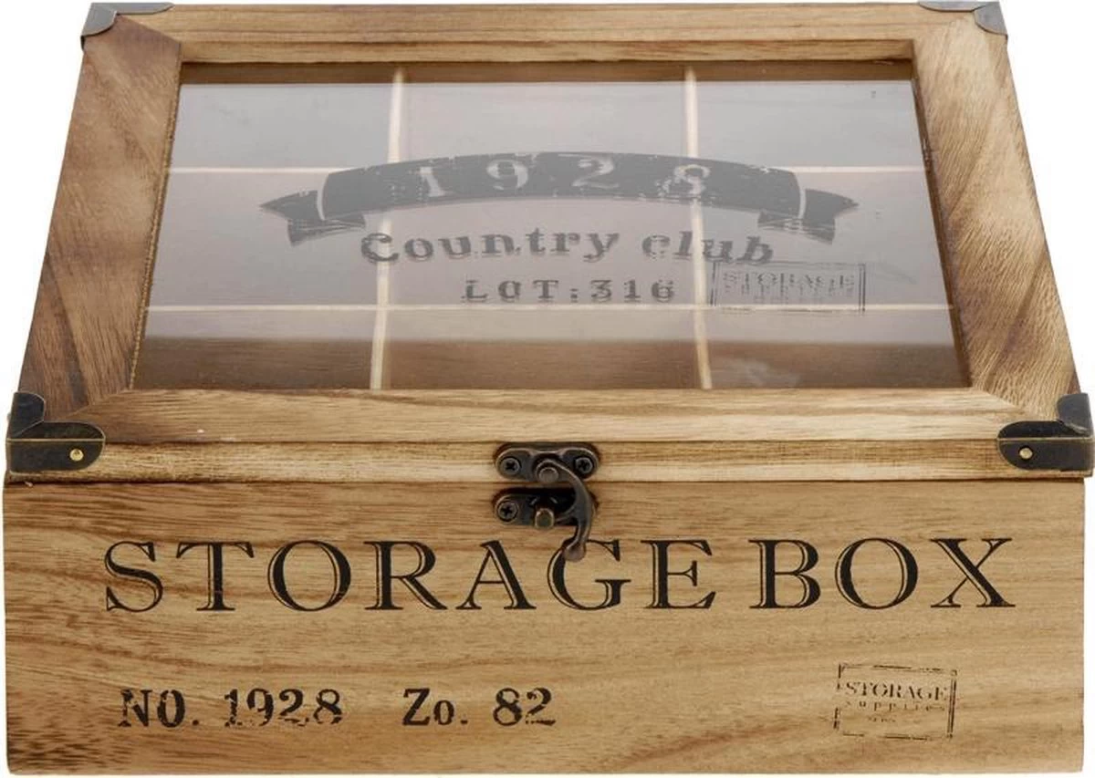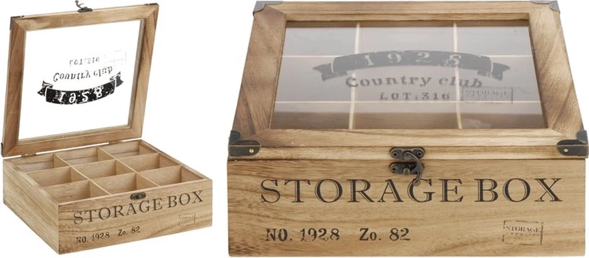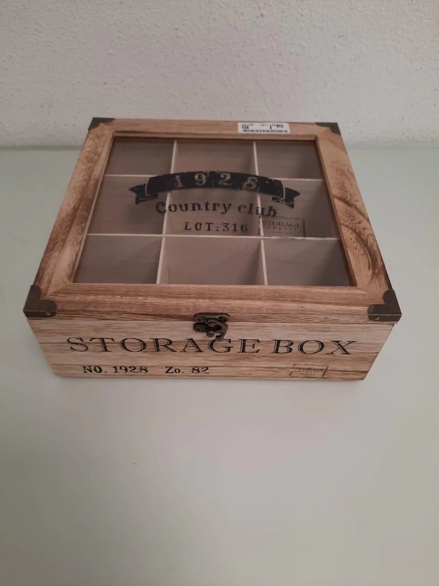 In de 9 vakken kun je altijd al je favoriete theezakjes in deze prachtige overzichtelijke presentatie doos bewaren. Deze luxe theekist is gemaakt van hout en heeft een doorzichtige glazen deksel bedrukt met een logo en tekst ‘1982 Country Club Lot. 316’ op de bovenkant en ‘Storage Box No. 1982 Zo. 82’ op de voorzijde.
