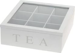 Een 9-vaks theedoos/theekist met de tekst Tea. Afmeting: ca. L23 x D23 x H8 cm. De theedoos is geschikt om theezakjes van 6,5 cm (Pickwick) rechtop neer te zetten. Materiaal: mdf/hout. Theedozen/theekisten van hout home/deco/keuken accessoire.
