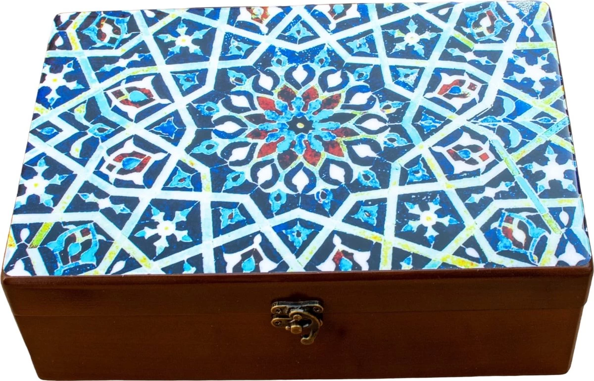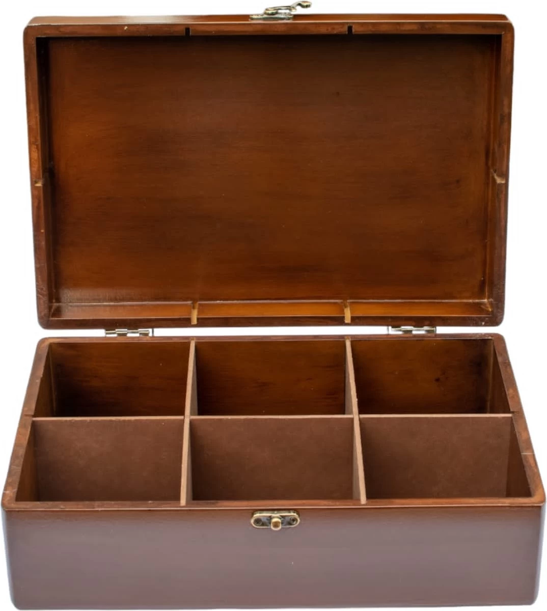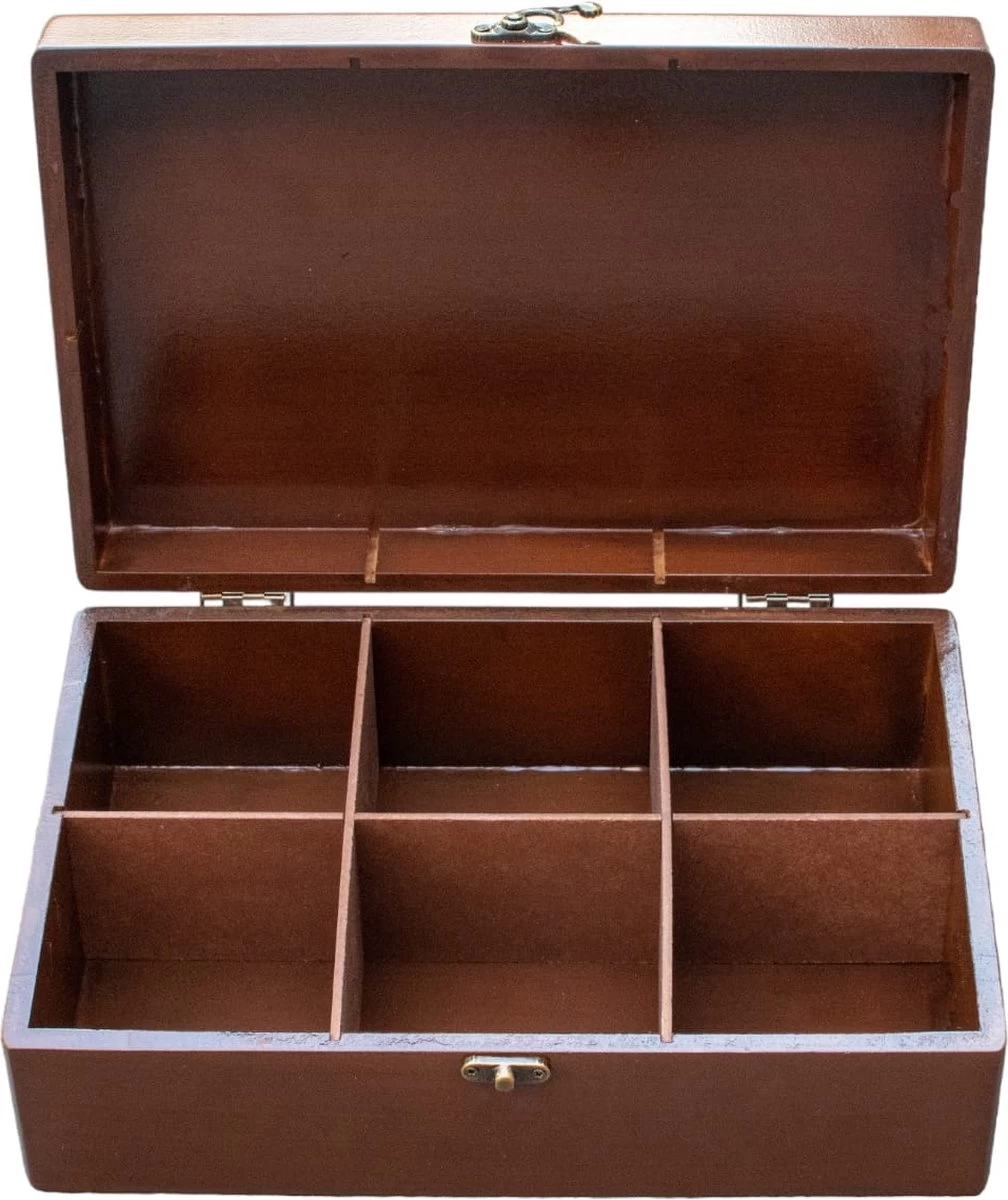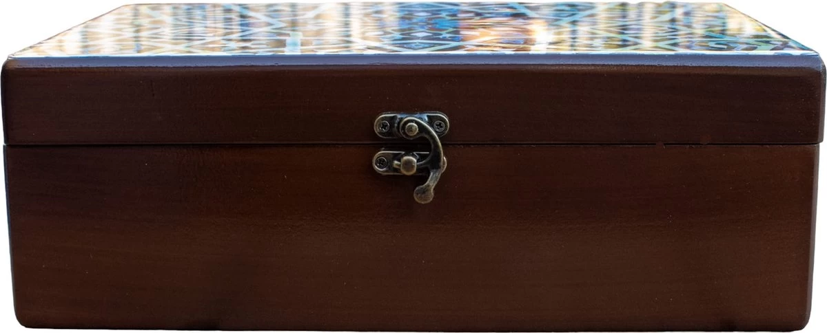 Mooi afgewerkte theedoos met een uniek patroon. De theedoos is hoog genoeg om theezakjes in op te bergen. Ook is het een ruime theedoos waar je genoeg theezakjes in kwijt kan. De binnenkant bestaat uit zes vakjes van 9x9cm. Het patroon van de theedoos is met de hand aangebracht. Dat maakt de theedoos erg uniek en exclusief. Je gaat hem dus niet gauw ergens anders tegenkomen. En het is natuurlijk extra leuk om jouw verschillende soorten thee te presenteren aan je gasten in een unieke theedoos.